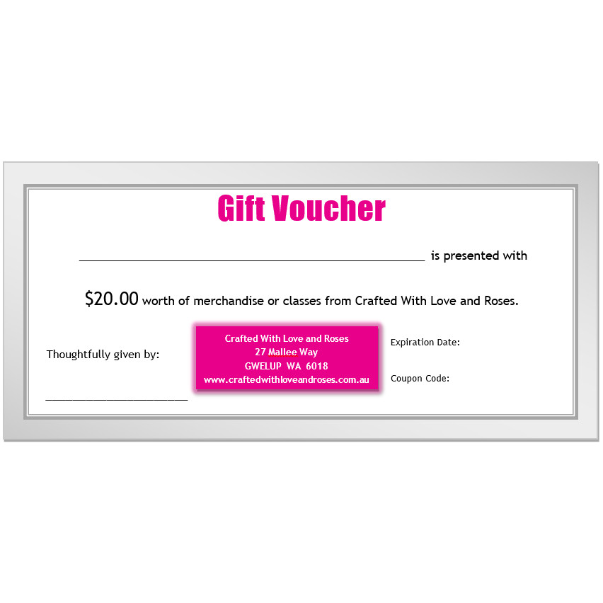 • Gift vouchers contain a code that can be used online (enter the gift voucher code in the “Coupon Code” box at checkout), or it can be used for local pickup of items or for scrapbooking and card classes (Perth Metropolitan only).