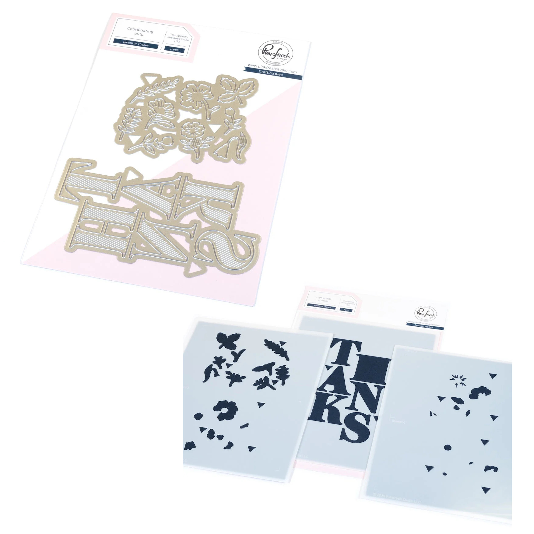 Craft layered greetings with the Bloom of Thanks stencil and die (sold separately), designed by Inna Moreva. This versatile design combines bold stacked letters spelling “THANKS” with charming floral accents.
