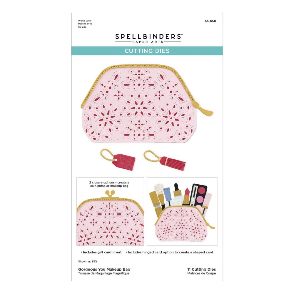 Gorgeous You Makeup Bag Etched Dies are from the Gorgeous You Collection. This versatile set of 11 thin metal cutting dies creates a lovely makeup bag with a choice of a kiss clasp or zippered closure and either a beautiful pin dot design on the bag or to leave it solid. There are other accessories such as a tassel, a gift tag, and to add a gift card to the bag. Another option is to add S6-246 Gorgeous You Makeup pieces for a fun look. Finished Bag size with Kiss Clutch measures 4.89 x 3.72 in./12.40 x 9.40 cm and finished bag size with makeup pieces: 5.77 x 5.40 in./14.70 x 5.40 cm.Approximate Size:Bag Outline: 4.90 x 3.30 in./12.40 x 8.40 cmBag Design Insert: 4.72 x 3.09 in./12.00 x 7.90 cmDecorative Bag Edge Layer: 4.90 x 1.90 in./12.40 x 4.80 cmZipper Pull Base: 0.30 x 1.00 in./0.80 x 2.50 cmZipper Pull Layer: 0.25 x 0.40 in./0.60 x 1.00 cmTag Outline: 0.90 x 0.60 in./2.30 x 1.50 cmFor You Tag Insert: 0.64 x 0.48 in./1.60 x 1.20 cmTag Chain: 0.75 x 0.45 in./1.80 x 1.10 cmKiss Clasp Closure: